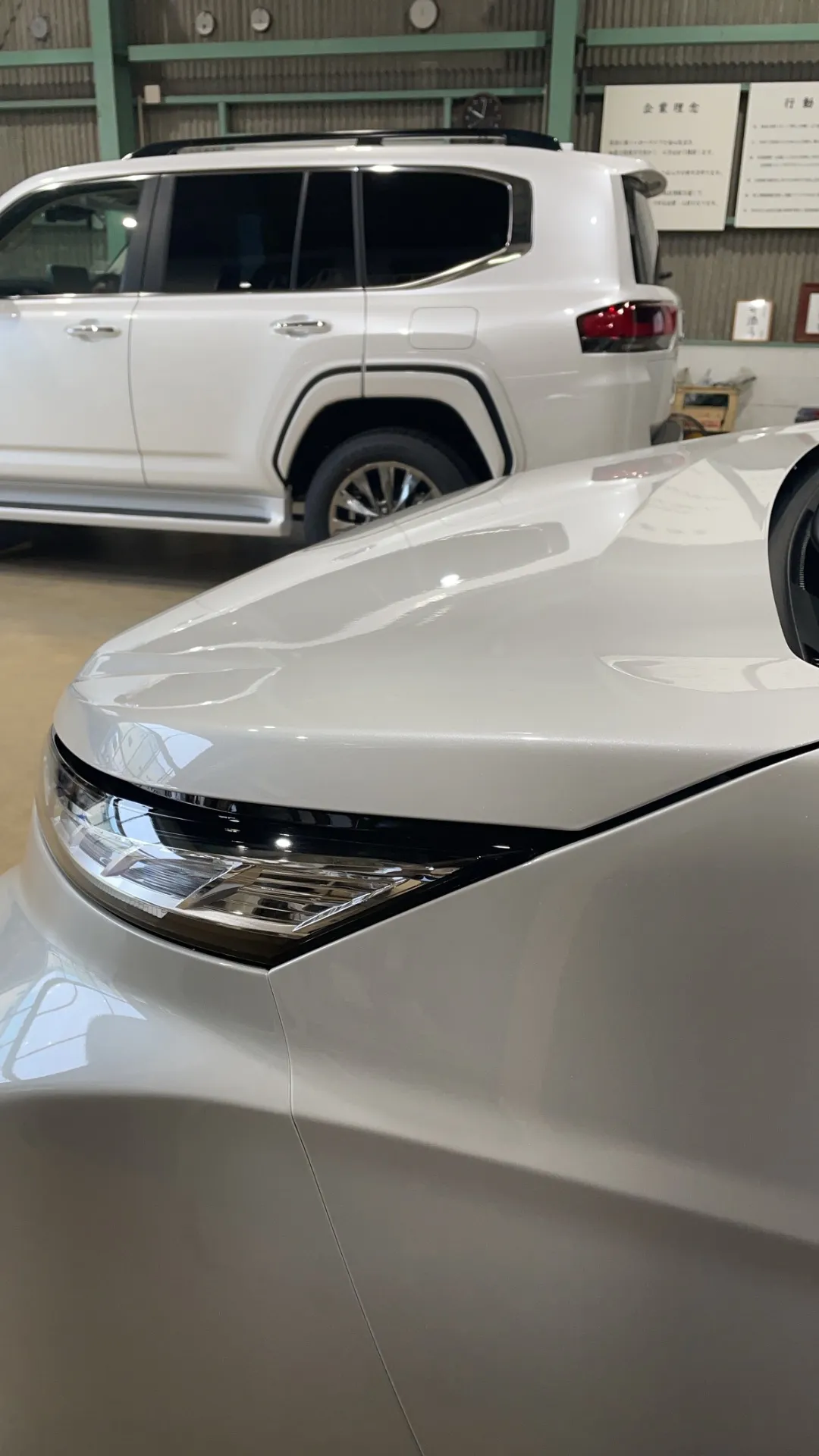 そんなに洗う機会がないかも?とのご返事で選ばれたのは毎年コーティングです。やはり数か月も経つと、少し艶が引けてきていましたので全体を鏡面研磨でツヤツヤに磨きます。2枚目の写真のボンネットを見てください。向こうのランクルがクッキリ映っていますよね。