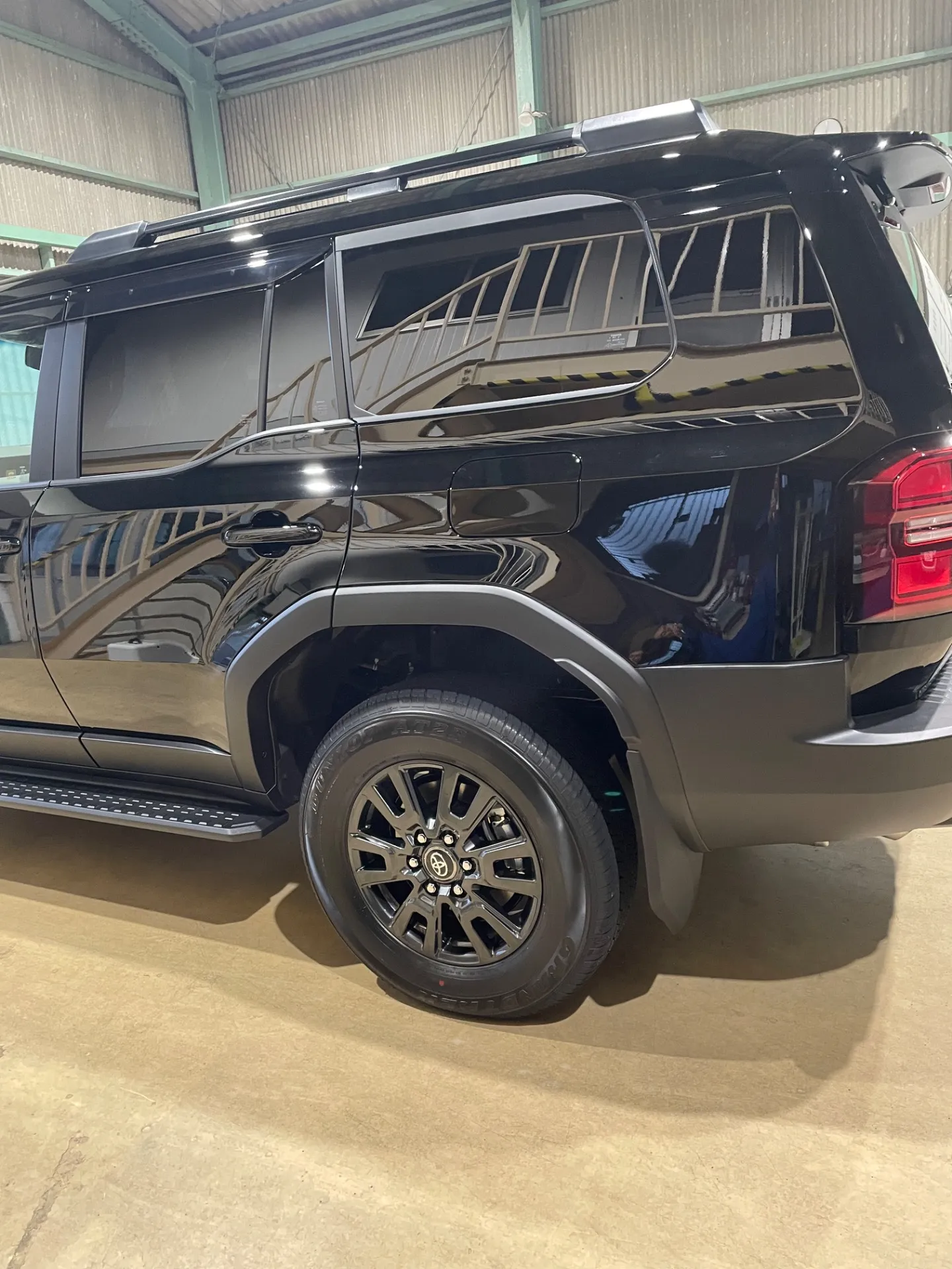 黒色のランクル250が納車され、数日後にお持ち込みいただきました。新車といえどやはり水平面には雨のシミがびっしり!マシン研磨でしっかり落としてツルツルに。