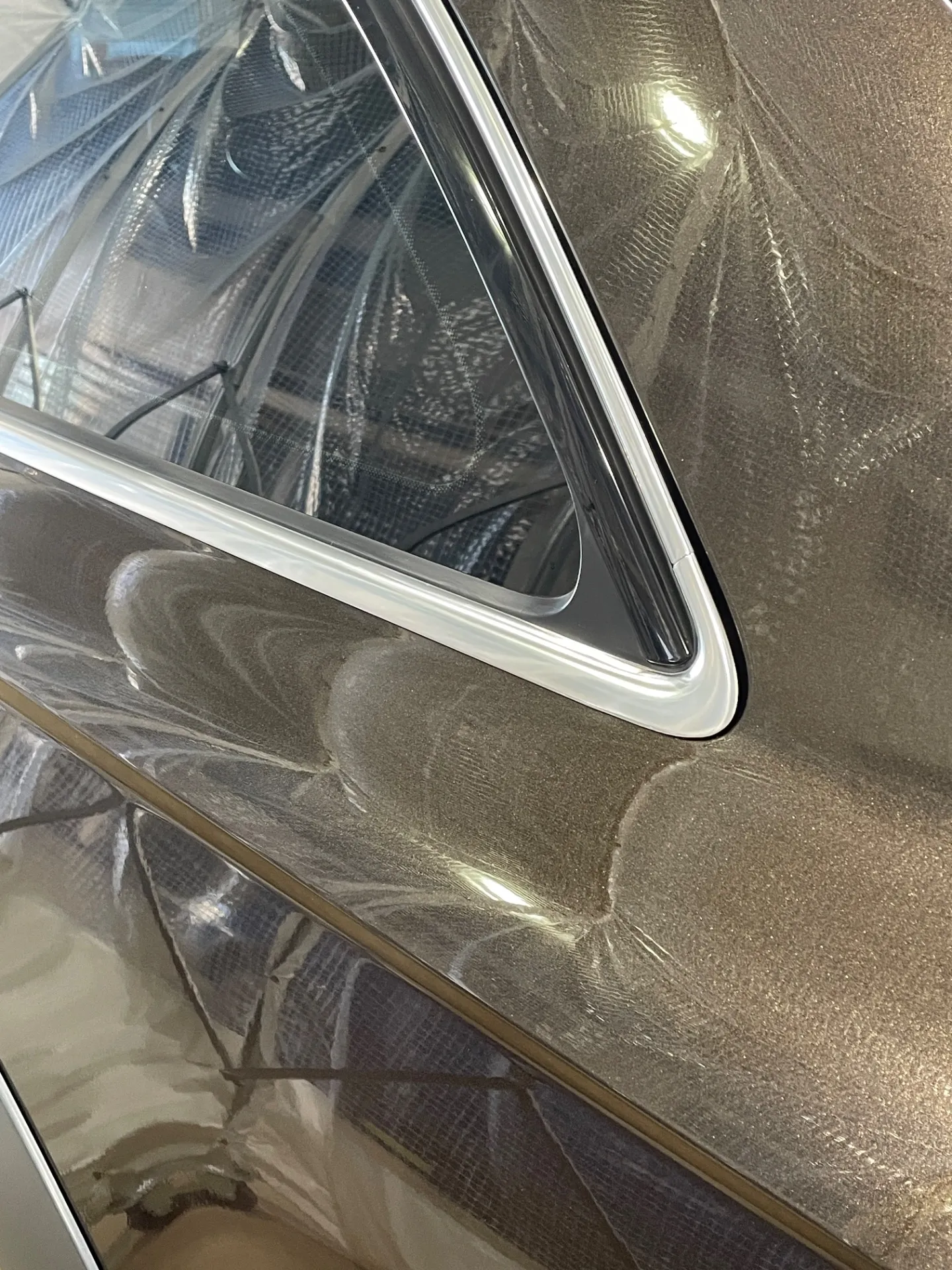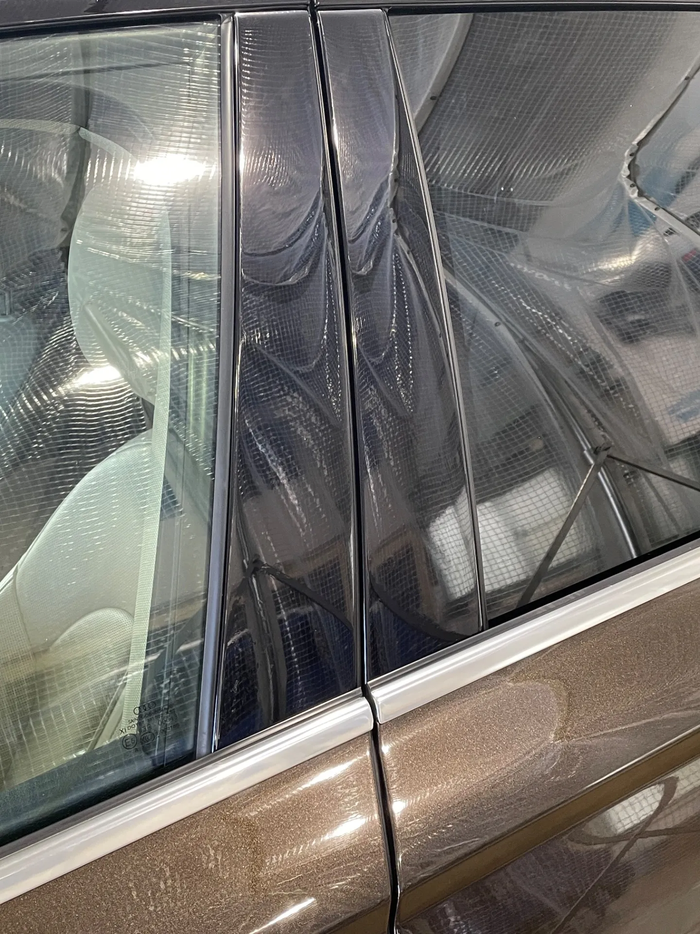 数年前にどこかで窓モールのプロテクションフィルムを貼ってもらったようで、リヤフェンダーのカーブしているところが浮いてきて、貼り替えを。一緒に一番指紋が付いて目立つセンターピラーにもプロテクションフィルムをお願いされました。